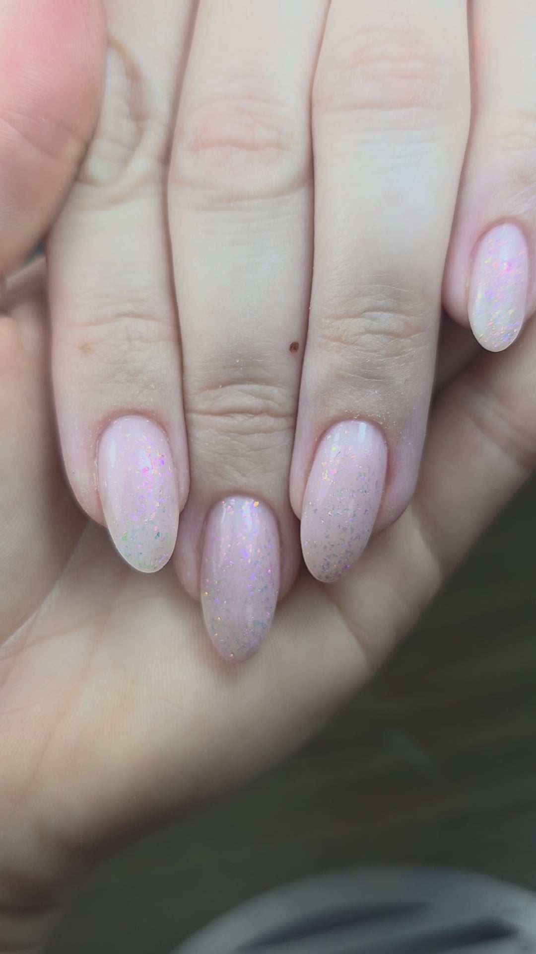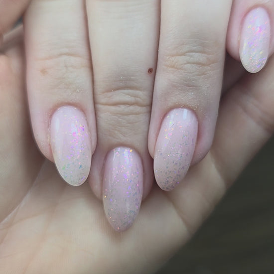 De tweede is helemaal spectaculair, dit is een chamelon topgel. De flakes veranderen in het licht en variëren van roze, naar goudtinten, van paars naar groenblauw. Chameleon flakes zoals we die vroeger hadden maar dan nu met een stapje minder, super gemakkelijk.